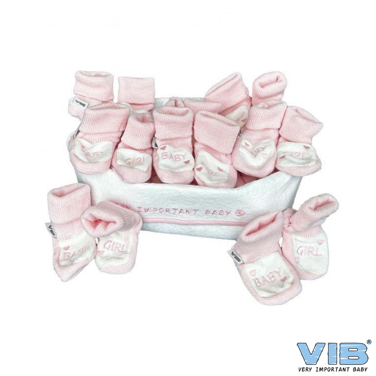 Commodemandje voor toonbank presentatie gevuld met 18 Baby Girl ROZE Slofjes