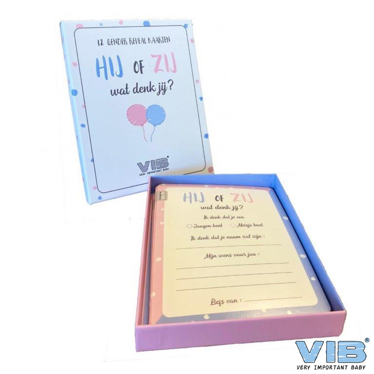 Box met 12 VIB® Gender Reveal 'Hij of Zij, wat denk jij?' Cards (invulbaar & bewaarbaar)