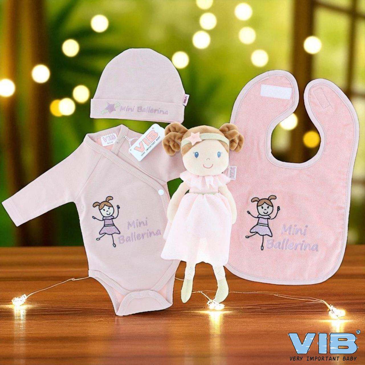 Collection by VIB® “Mini Ballerina”. Composée de: 2x Ballerina en peluche (VIB-DOLPP001-8718719359112) 6x Bavoir 'Mini Ballerina' Rose Smoke (VIB-BTRS03-8718719359518) 6x Bonnets Rond '