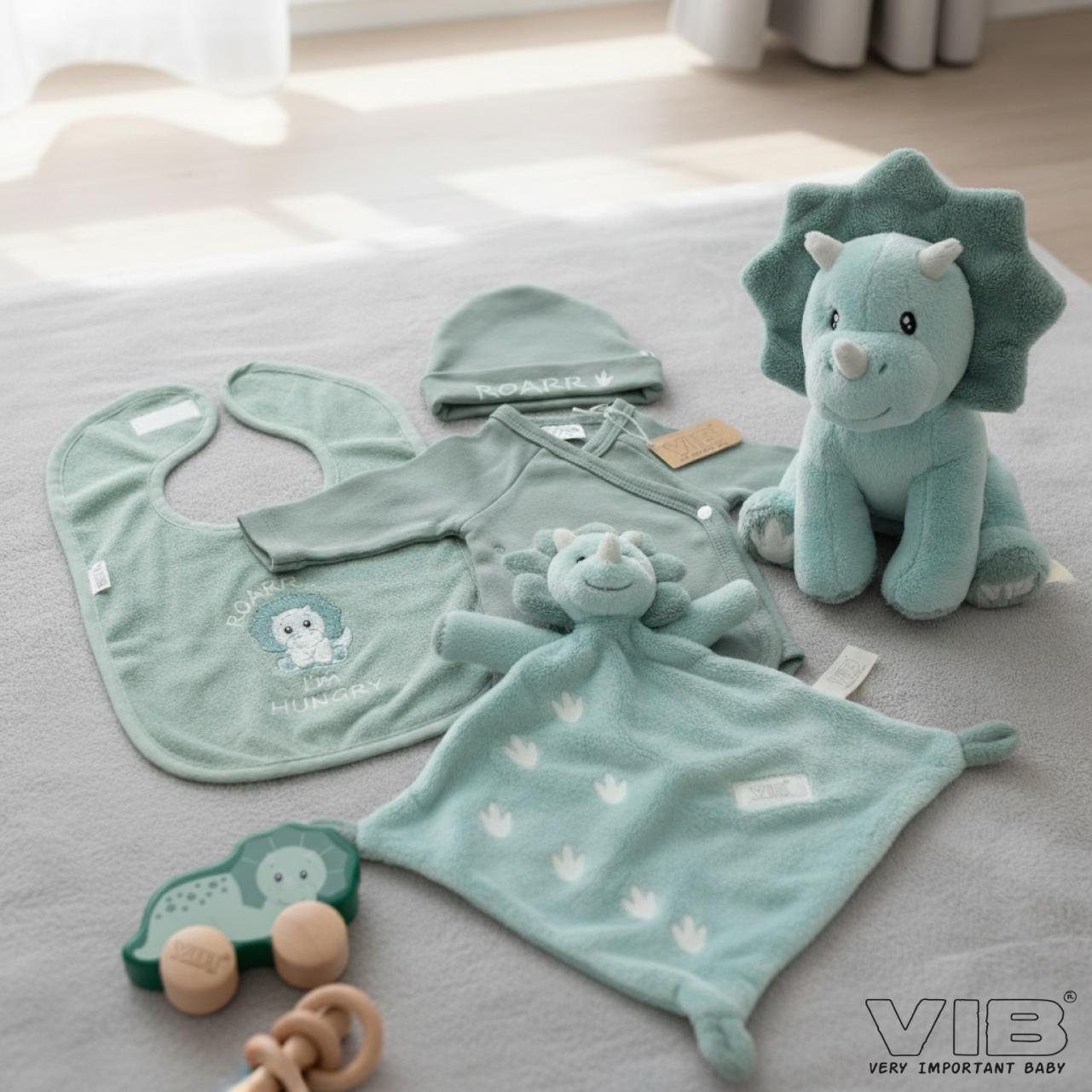 Pre Order - VIB® 'DINO'-Pack. Delivery in the first half of May 2026, consisting of: 1x6 Baby Suit Dino Collection BABY SAURUS Forrest Green (VIB-BSTDM303 - 8718719359525) 1x6 Hat Round D